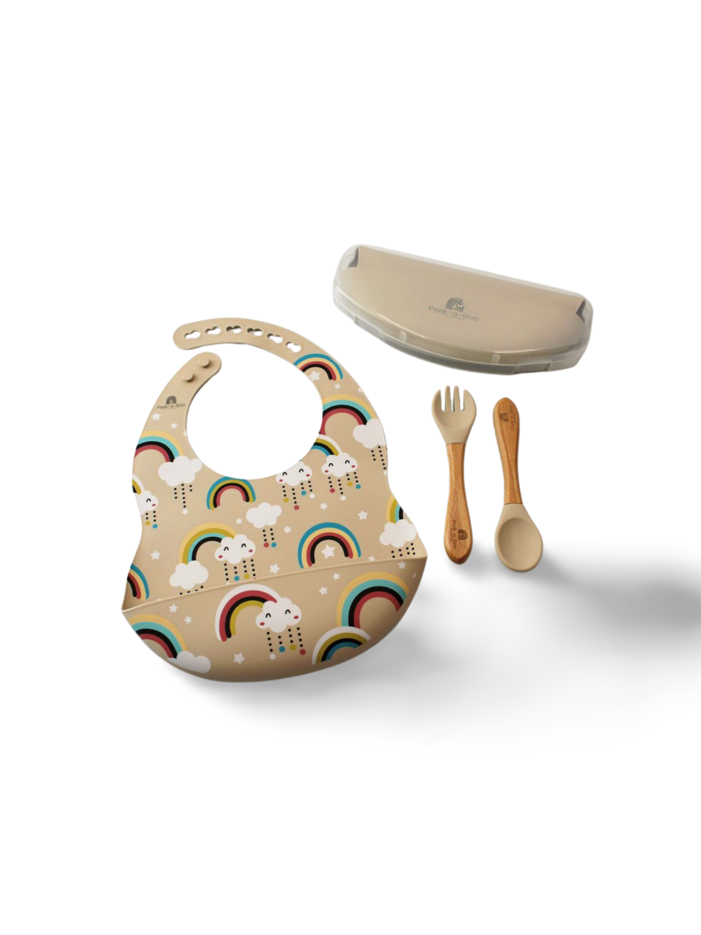 The perfect clear branded travel case includes an adjustable silicone bib, and a fork and spoon set that have soft silicone heads and beechwood handles. Perfect for outings to the restaurant , picnics and so on.