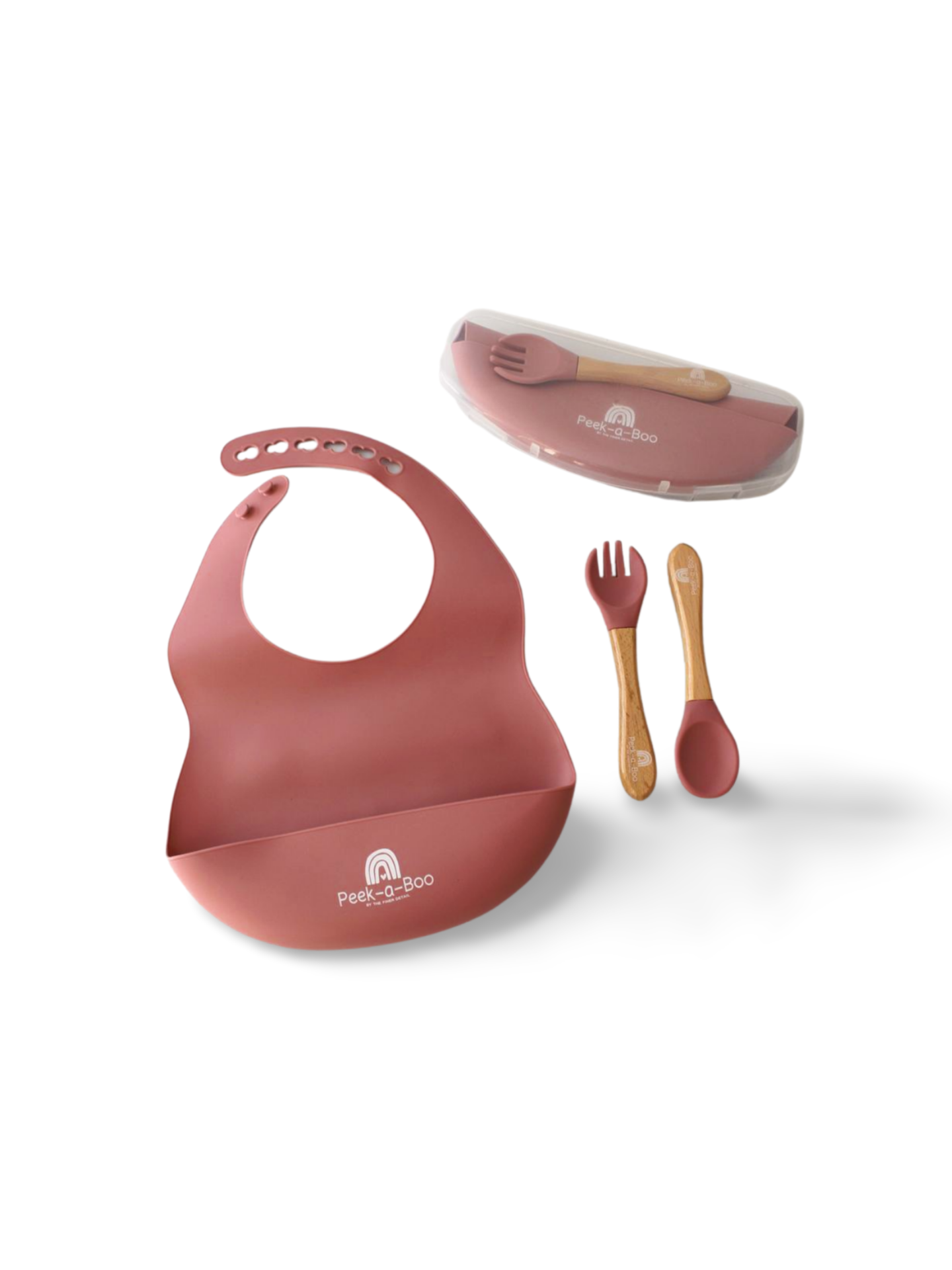 The perfect clear branded travel case includes an adjustable silicone bib, and a fork and spoon set that have soft silicone heads and beechwood handles. Perfect for outings to the restaurant , picnics and so on.