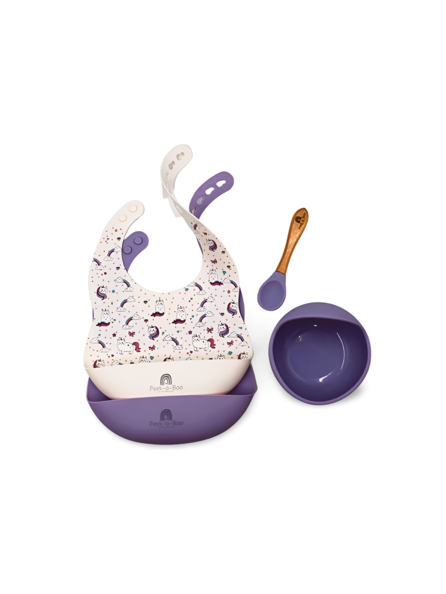 Make mealtimes fun and mess free with our Starter 4pc silicone feeding set which will accompany your little throughout their growing stage. Each set comes with an adjustable silicone bib, a perfectly sized feeding bowl with a suction cup bottom, and a spoon that has a soft silicone head and beechwood handle. Easy to clean and use. These baby products are also microwave safe, freezer safe and dishwasher safe.