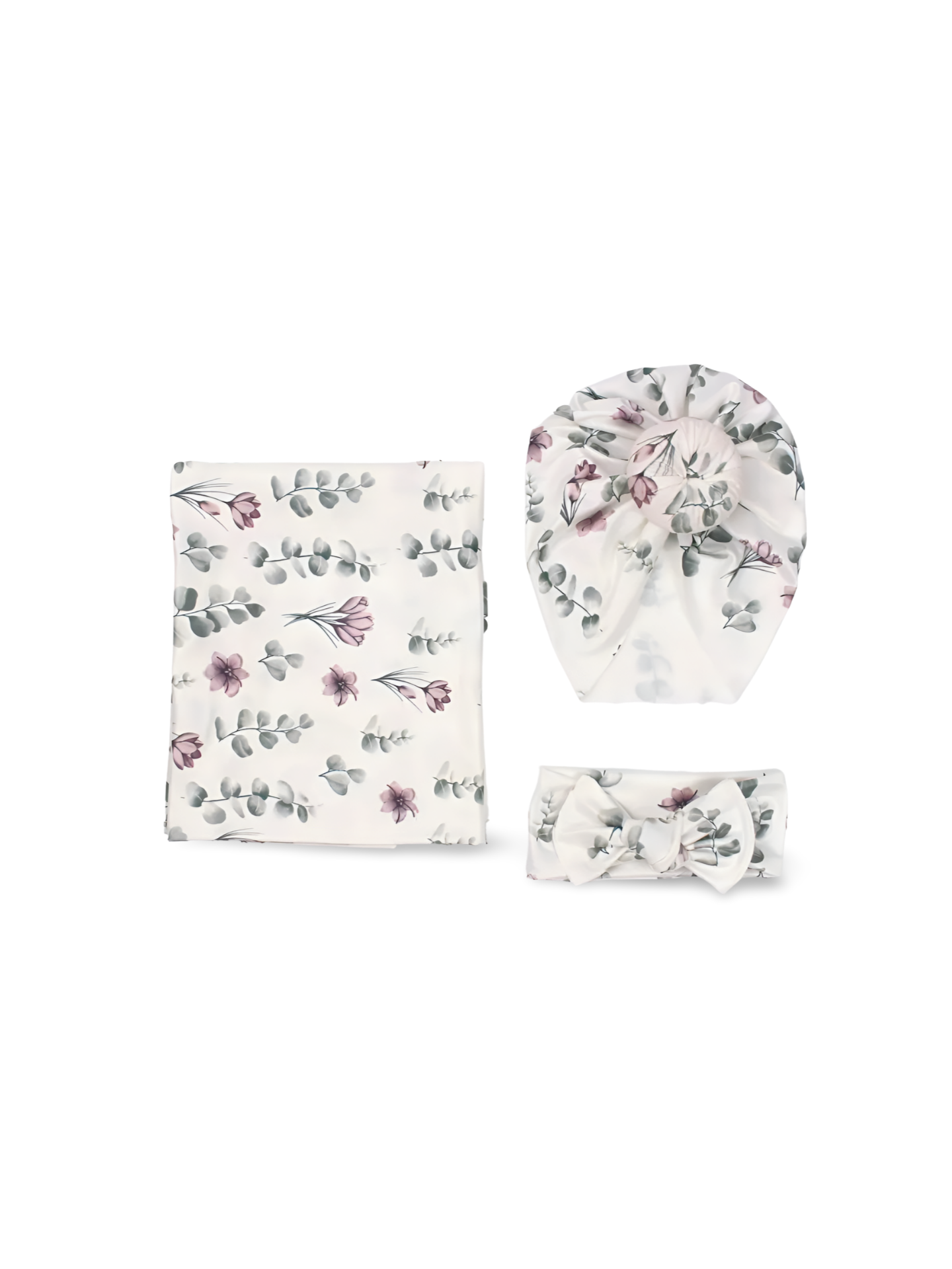 Introducing our 3-piece Swaddling Set, which includes a generously sized swaddle blanket (90cm x 90cm), a charming donut turban hat, and an adorable bow. This set is designed to provide ultimate comfort and style for your little one, making it perfect for swaddling, use in the pram, nursing, or playtime.